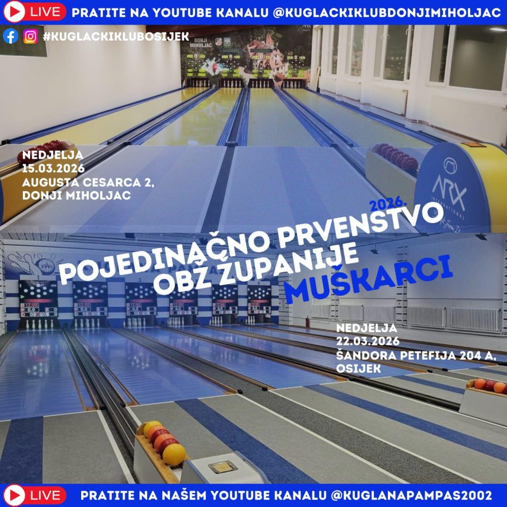 Pojedinačno prvenstvo muškaraca Osječko-baranjske županije za 2026. godinu održat će se na kuglanama "Stadion" u Donjem Miholjcu i "Pampas" [...]